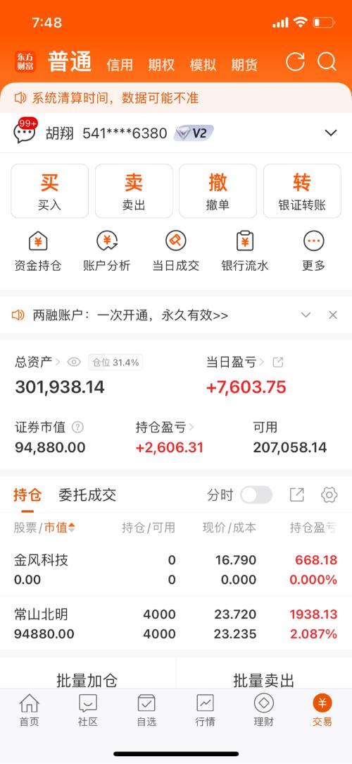 下午平盘介入常山北明,吃到2个点!