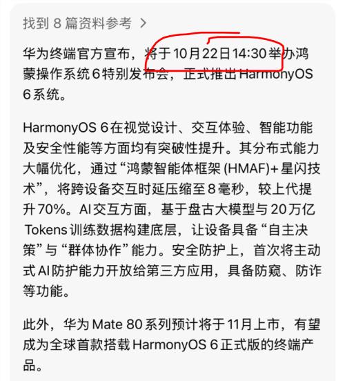 华为终端官方宣布,将于10月22日14:30举办鸿蒙操作系统6特别发布会,正式推出HarmonyOS6系统。 HarmonyOS6在视觉设计、交互体验、智能功能及安全性能等方面均有突破性提升。其分布式能力大幅优化,通过“鸿蒙智能体框架(HMAF)+星闪技术”,将跨设备交互时延压缩至8毫秒,较上代提升70%。AI交互方面,基于盘古大模型与20万亿Tokens训练数据构建底层,让设备具备“自主决策”与...