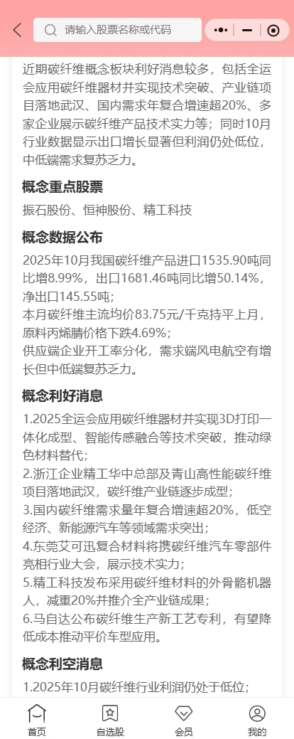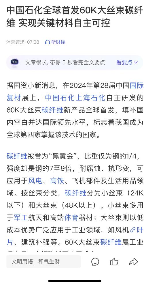 最近碳纤维题材应该也是一个风口,政策、需求、技术全凑齐了,行业正从底部往上冲。 政策端刚出了绿色金融支持目录,碳纤维全产业链都能拿低息贷款。需求端更猛,风电叶片、新能源汽车都在抢货,连国产大飞机都在加量用。国产化率越来越高,成本降下来了,下游应用直接爆发。 在希财舆情宝看了一下板块分析情况:近期碳纤维概念板块利好消息较多,包括全运会应用碳纤维器材并实现技术突破、产业链项目落地武汉、国内需求年复合增...