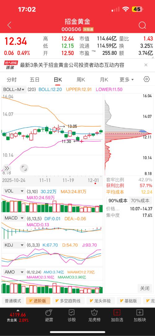 $招金黄金(SZ000506)$小阴小阳蚂蚁上树,股价在主力成本线上是安全的,这票就是很磨人第一波主升浪的时候大家可以感受到。上方还有不少套牢盘,股价打到上轨短线可以减一点仓,长线拿稳就可以了。今天加了一点仓微赚。