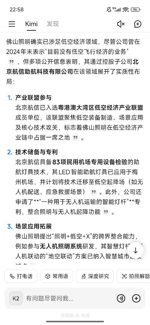 $佛山照明(SZ000541)$佛山照明确实已涉足低空经济领域,通过控股子公司北京航信助航科技有限公司在该领域展开了实质性布局。