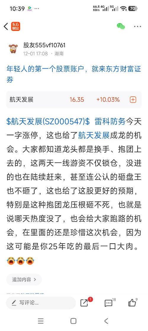 $航天发展(SZ000547)$你太强了啊,带了好多后排小弟往上冲,小弟都涨停了