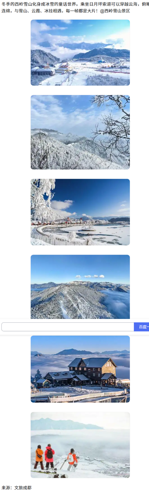 窗含西岭千秋雪 正在下!成都西岭雪山下雪啦! 受寒潮天气影响,从12月12日傍晚到12月13日,成都西岭雪山景区迎来明显降雪。目前,海拔3250米的日月坪区域已覆盖积雪,再现“窗含西岭千秋雪”的经典诗意景观。在西岭雪山日月坪现场,不少游客打雪仗,堆雪人……开心玩雪。 据悉,2025年成都市冬季文旅消费季暨第26届西岭雪山南国冰雪季,将于12月19日正式启动。本次活动以“千年雪韵·更近成都”为主题,...