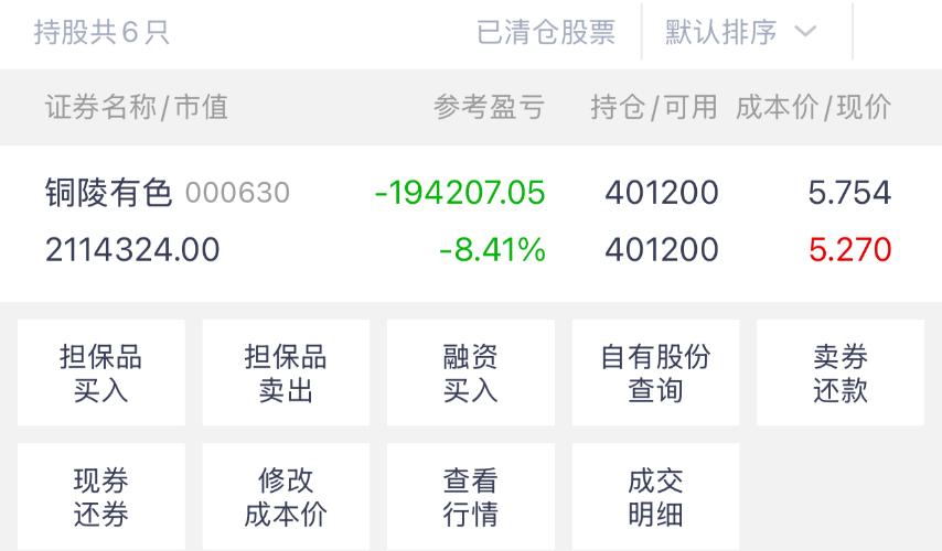 $铜陵有色(SZ000630)$今天成本降到了5.754,争取两点,一是元旦前降到5块以下。二是盈亏能翻红。 盈亏翻红感觉难度有点大,总感觉铜陵有色在走下坡路,坚持就有收获
