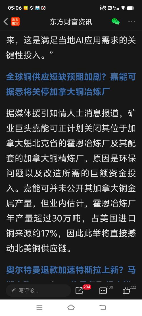 $铜陵有色(SZ000630)$ 全球铜供应短缺预期加剧?嘉能可据悉将关停加拿大铜冶炼厂 财联社20分钟前约4分钟据媒体援引知情人士消息报道,矿业巨头嘉能可正计划关闭其位于加拿大魁北克省的霍恩冶炼厂及其配套的加拿大铜精炼厂,原因是环保问题以及改造所需的巨额资金投入。 嘉能可并未公开其加拿大铜金属产量,但业内估计,霍恩冶炼厂年产量超过30万吨,占美国进口铜来源约17%,因此此举将直接撼动北美铜供应链...