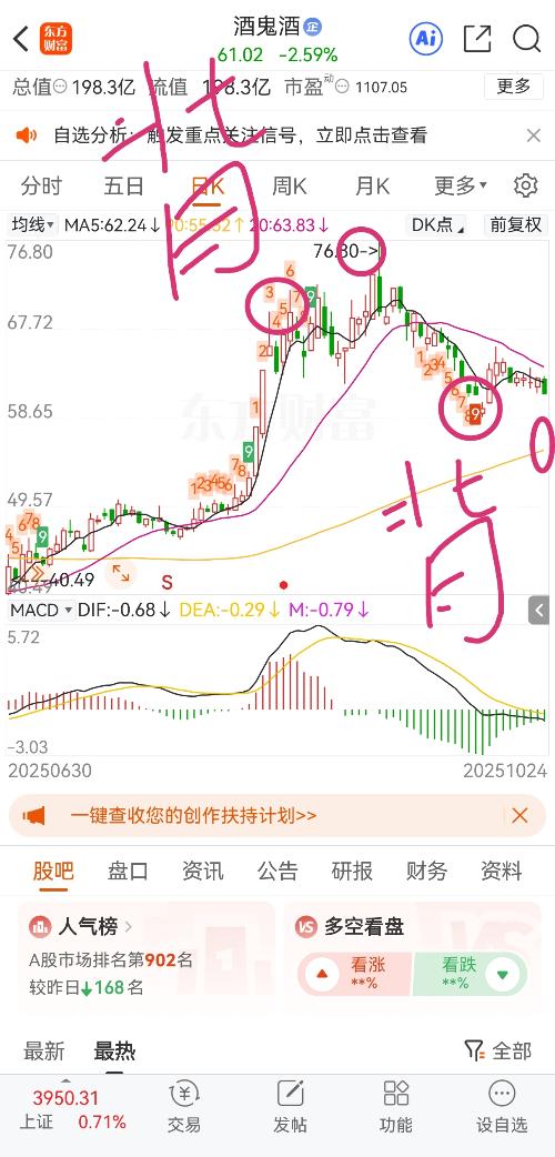 $酒鬼酒(SZ000799)$ 技术分析是所有人认可的交易行为! 正好帮新粉丝补补专业课,我们只讲有用炒股知识,具有辨识度的方法!分析结束,买卖股票就会很轻松,不会纠结! 认可就会产生资金共识度效应,目前市场资金是科技,银行两大重头,形成跷跷板效应,资金在这两个方向来回切换,其他板块轮动上涨都没有! 最近很多人把之前技术分析忘了,那是大大的错误,技术分析是市场百分之95的主流派 很明显,白酒出现低...