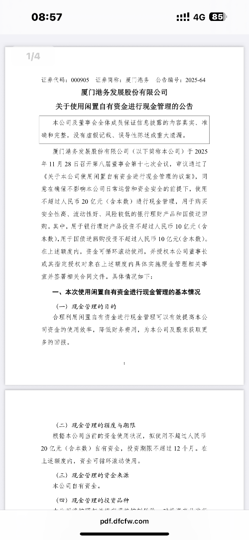 公告 厦门港务:厦门港务关于使用闲置自有资金进行现金管理的公告