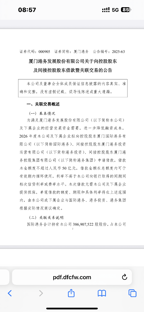 公告 厦门港务:厦门港务关于向控股股东及间接控股股东借款暨关联交易的公告