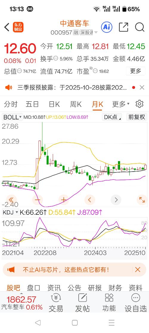 我猜中通客车明天周一2025.10.27,不是涨,就是跌。涨跌皆可有?那是在盘面。