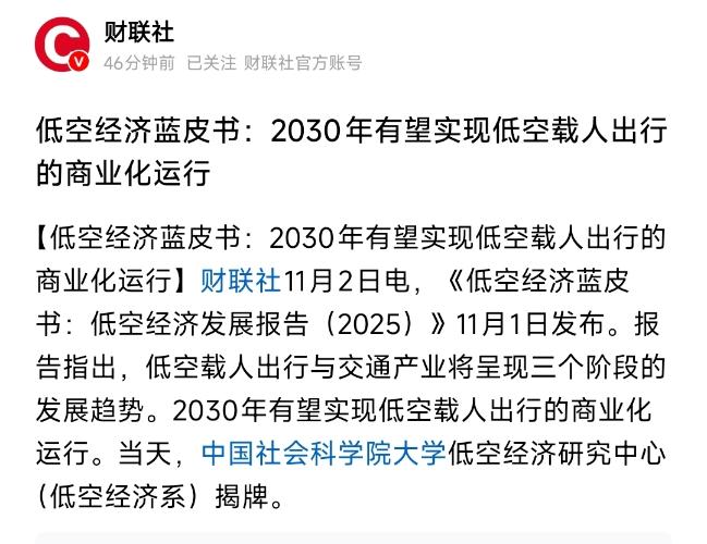 《低空经济蓝皮书:低空经济发展报告(2025)》11月1日发布。报告指出,低空载人出行与交通产业将呈现三个阶段的发展趋势。2030年有望实现低空载人出行的商业化运行。当天,中国社会科学院大学低空经济研究中心(低空经济系)揭牌。