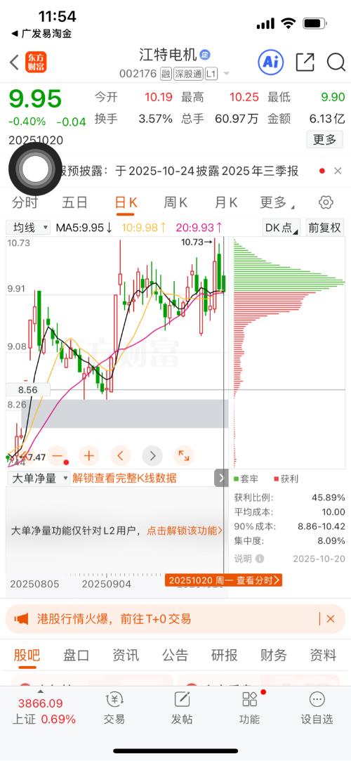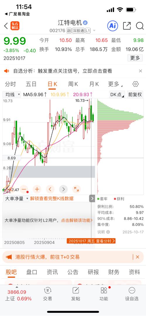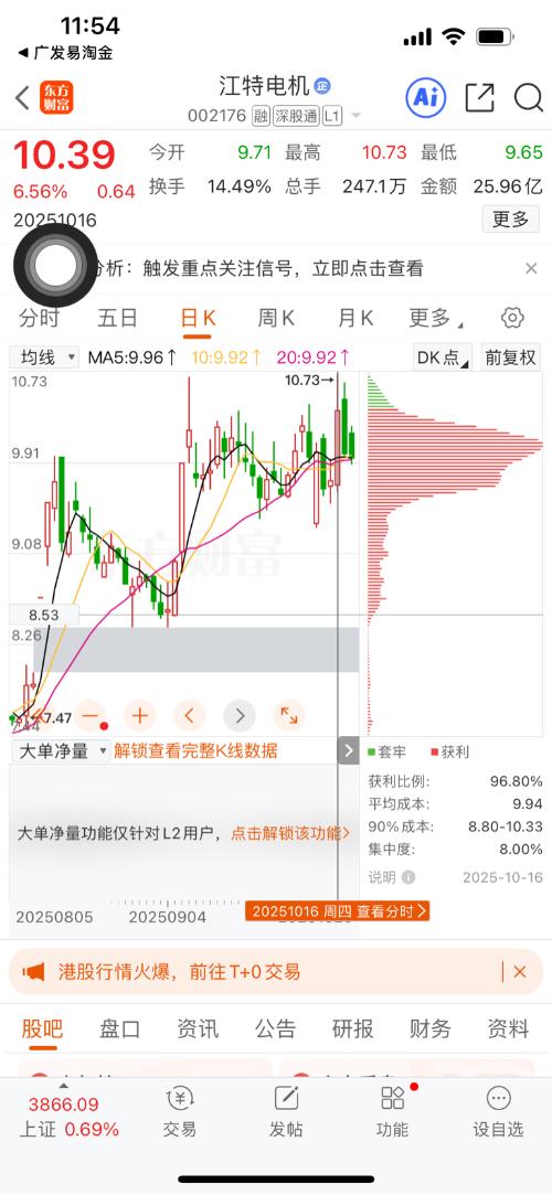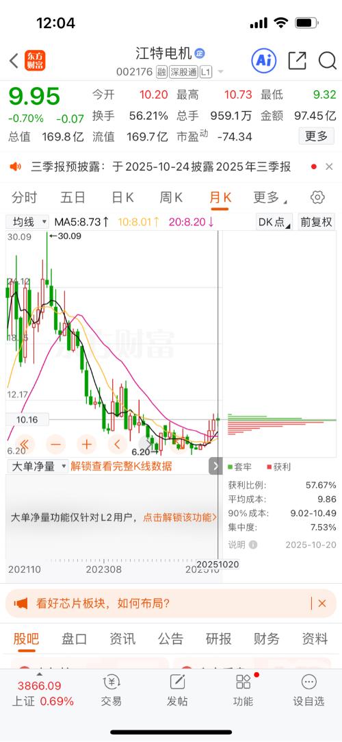 $江特电机(SZ002176)$月线走势稳了,主力10.16日进场5亿,为什么不是拉高出货?前主力的筹码早在第二波拉起来的时候就出了一半,横盘期间又出了一半,基本不叫主力了。为什么主力进来不拉?第一筹码不够,第二是第二波起来后上方套牢盘太多,加上周五大盘不行,这个位置很尴尬,上有套牢盘,下有获利盘,还得震荡。三季度预告有没有可能扭亏,主力提前知道消息了,16日才进的场。反正这票拿到手里不慌,你跌回...