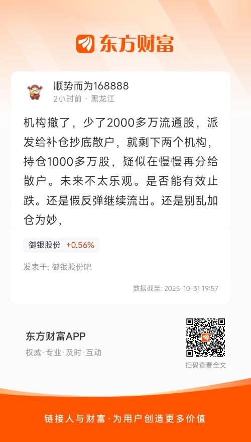 顺势而为168888 更新于 10-31 21:14 411次浏览 机构撤了,少了2000多万流通股,派发给补仓抄底散户,就剩下两个机构,持仓1000多万股,疑似在慢慢再分给散户。未来不太乐观。是否能有效止跌。还是假反弹继续流出。还是别乱加仓为妙, 3赞