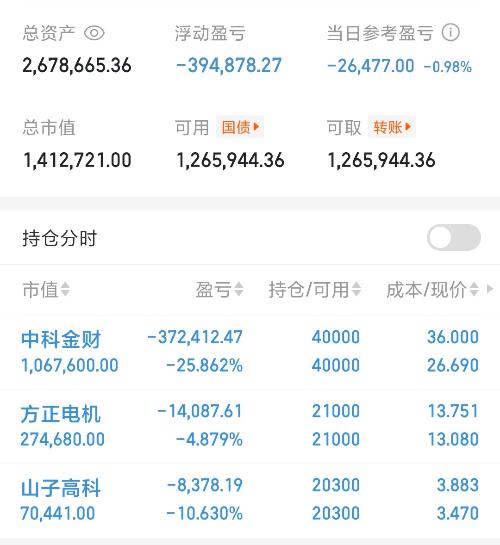 挑战50万一年做到500万(第181天) 当前资金:2,678,665 今作: *持仓:中科金财山子高科方正电机 *新入: *出局: 特别声明: 本实盘记录旨在分享个人对A股走势的思考、研判及投资认知的实践过程。 仅供交流讨论,**不构成任何投资建议**!据此操作,风险自负!股市有风险,投资需谨慎! $中科金财(SZ002657)$$方正电机(SZ002196)$$山子高科(SZ000981)$