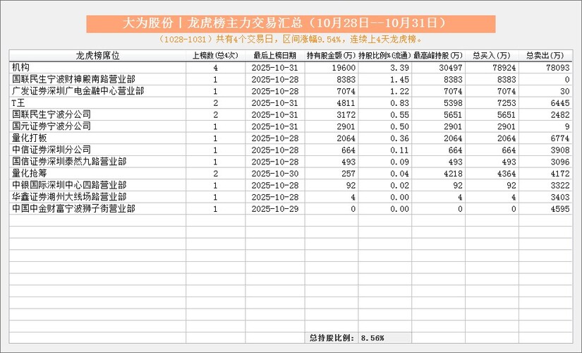 大为股份丨龙虎榜主力交易汇总(1028-1031)