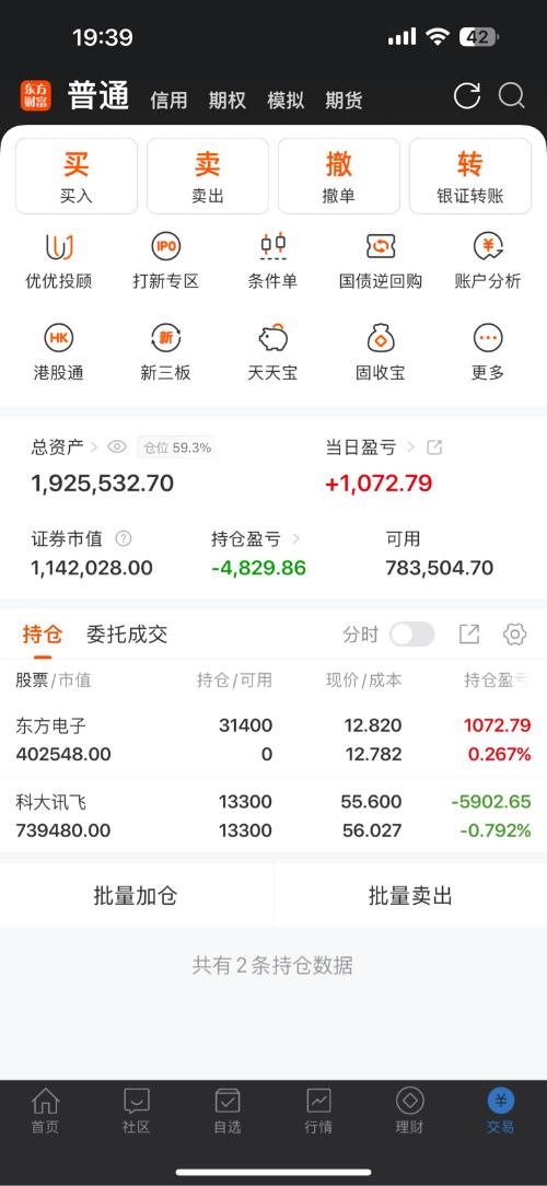 $科大讯飞(SZ002230)$实盘笔记,科大一直在养着,其实开盘也红过,但是没想过要走,毕竟大半月都熬过来了,这个位置也不会轻易走的。至于新的东方电子,要看明天有没有资金合力。总之今年账户目标就一个,上200,然后稳住! $东方电子(SZ000682)$