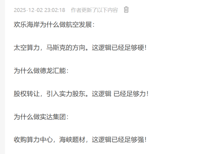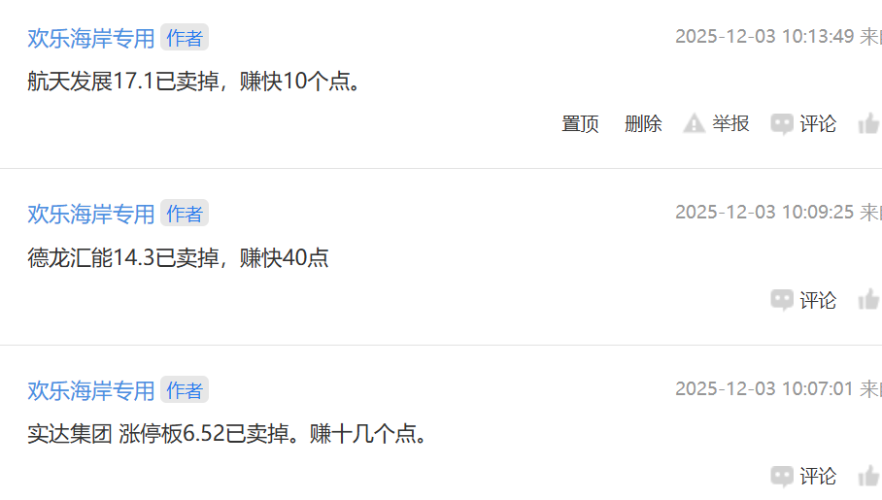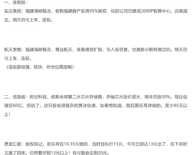 348- 12月9日(周二)提前知: 1,前一周,做了航天发展,实达集团,德龙汇能。航天发展:仅6天时间, 赚63%以上。实达集团 ,仅6天时间,赚30% 以上(做T)。德龙汇能,10元左右做,当时目标价定13元,上周也涨到14元多。骏亚科技 ,今天早上开盘前做的。今天开盘,水下都 可以进,当天又是涨停板。骏亚明天别追了,已经赚钱。 2,欢乐海岸只做调研,有着很好逻辑的股,适合中户大户。10月底的平潭发展,还特地去了一次平潭岛,6块多就开始在做了。一个月翻倍了,现在13元。这段时间有跟着欢乐思路的,相信欢乐哥的,都吃到大肉。 3,为什么欢乐海岸可以做到航天发展这么好的股?我是有纪律的,不能说。 最后,只更新这一两天,欢乐海岸停更了。年初时,当时想过今年再翻几倍,将在12月时分享标的,让兄弟姐妹们都有肉吃。科创板的重组,没有在吧里讲。祝大家都能吃牛肉汉堡包!