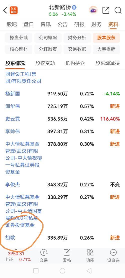 $北新路桥(SZ002307)$看来十大股东加仓了啊。这个新进的胡歌是演员胡歌吗?