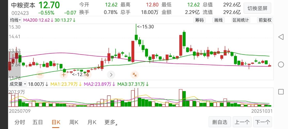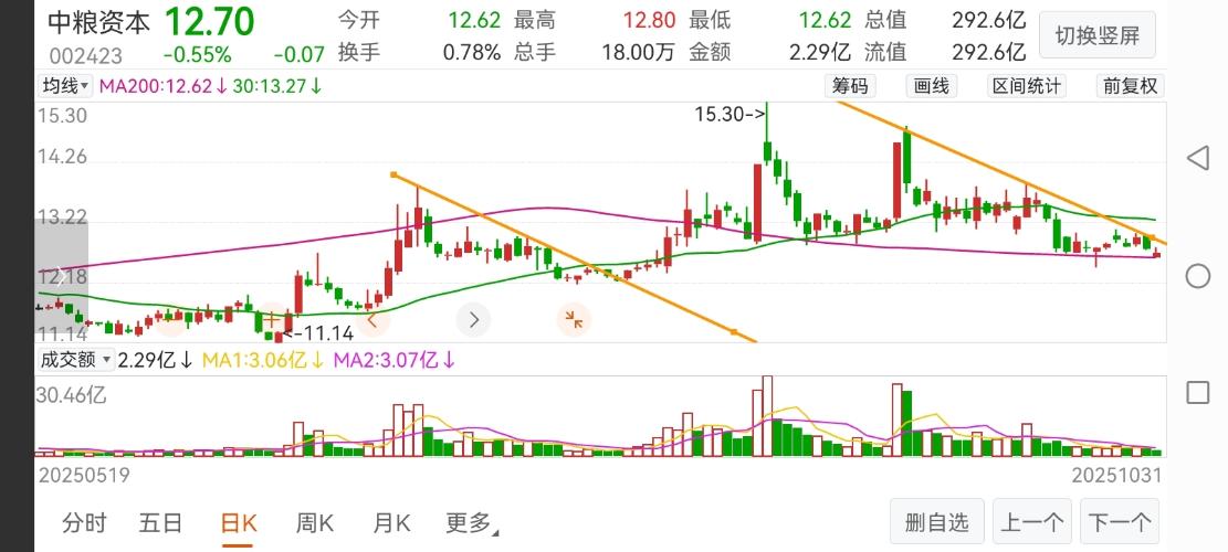 $中粮资本(SZ002423)$利空出尽,靴子落地,底部确认。二次探底正好到200日均线支撑处,也是30周均线上方,今天换手只有0.78%,是近期新低,自从15.3元高点出现后已经调整九周时间,时间已经完全到位,空间也到位。如果看日线我认为自前面低点12.45元就调整到位,现在已经在新一轮上涨周期中,是个小级别的二浪回调,到今天也到位了,下周开始应该是新的上涨周期中。三季度两家社保基金进驻中粮,三...