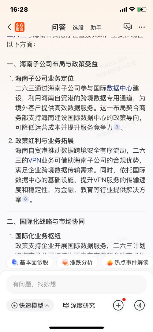 通义分析报告,海南封关后,二六三的VPN业务将迎来三重直接利好:跨境数据通道需求爆发封关后海南与境外的“一线放开”意味着大量企业、金融机构、跨境电商需要安全、稳定的国际网络连接。二六三持有的全国首批IP-VPN牌照,可为这些主体提供合规的虚拟专用网络,把原本分散的跨境流量整合到高安全、低延迟的专网中,订单确定性显著提升。海南子公司区位红利公司已在海南设立全资子公司,并于2024年9月增资2亿元。封...