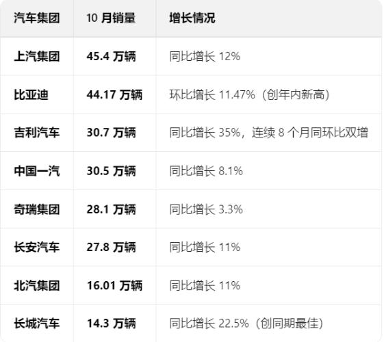银十车市头部领跑新能源与出海成增长双引擎 11月初,国内十大汽车集团10月销量成绩单陆续揭晓,“金九银十”的市场竞争较预期更趋激烈,行业“马太效应”持续加剧。上汽、比亚迪等头部企业强势领跑,新能源转型与海外布局成为各车企突破增长的核心动力。 上汽集团以45.4万辆的销量夺得榜首,同比增长12%。自主品牌与新能源业务表现尤为亮眼,自主品牌销量达30.6万辆,同比增长22%,上汽乘用车、大通、通用五菱...