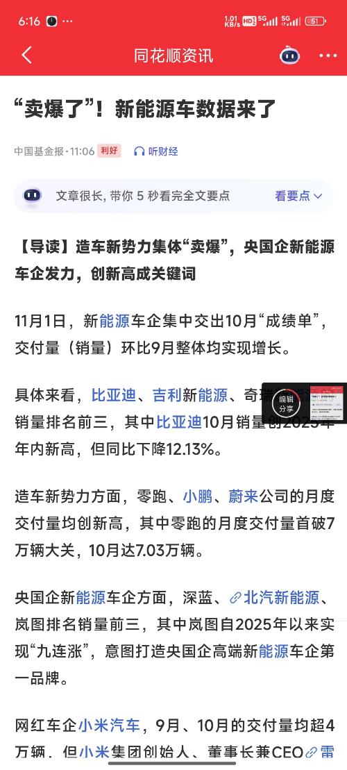 11月1日,各大新势力纷纷公布了10月份的销量数据。两极分化越来越明显,吉利银河月销逼近13万辆,成为最快达成年销百万的新能源品牌;零跑、鸿蒙智行、小鹏、蔚来这几家也创下了新高,都做出了各自的特色;奕派科技10月销量31107辆,广汽丰田铂智3X首度破万,这些动作挤压得腰部的新势力难受无比。$吉利汽车(HK|00175)$$比亚迪(SZ002594)$$丰田汽车(ADR)(NYSE|TM)$ 10...