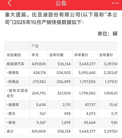资讯 比亚迪10月新能源汽车产量43万辆 销量44万辆