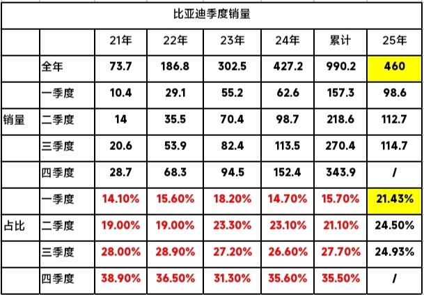 #周度策略##社区牛人计划#$比亚迪(SZ002594)$$比亚迪股份(HK|01211)$ 目前数据来看比亚迪年度460万销量目标可以完成。 数据来源于比亚迪销量公告 从21年—25年,比亚迪销售都呈现季度递增状态。因此四季度一定是比亚迪销量最高季度。前三季度已经完成70.86%年销量目标。那么四季度...