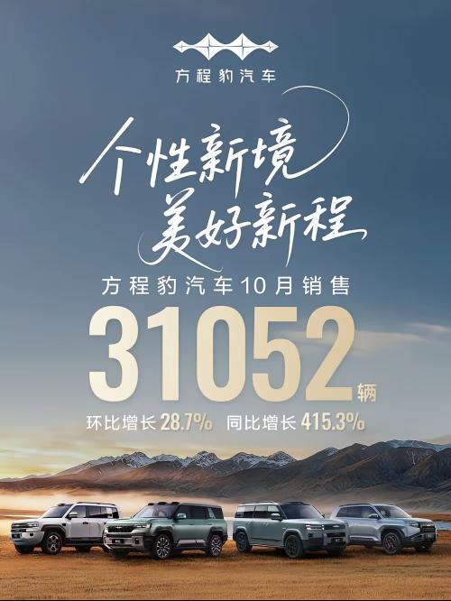 比亚迪10月销441706辆,方程豹31052辆,腾势10135辆,仰望654辆! 比亚迪10月销售441706辆,2025年1-10月累计销售3701852辆,新能源累计销售超1420万辆。 方程豹10月销售31052辆,方程豹钛7首个完整月销量20024辆,成交均价超21万,方程豹汽车累计销售208464辆,是最快达成20万销量的新势力品牌T0P3,成交均价近24万。 44万辆的单月销量意味着...