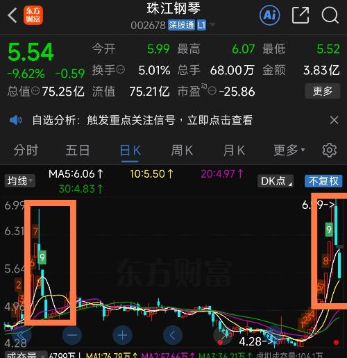 $珠江钢琴(SZ002678)$历史总是惊人的相似,但不会简单重复,看周线可知未来走势!每次周线出现大涨,第二周出现大阴!随后半年将持续阴跌!恭喜在大涨下车的朋友们!