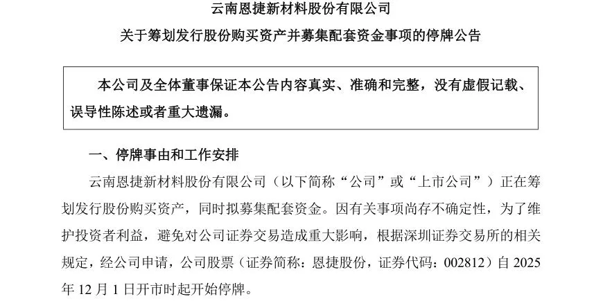 市值500多亿元的恩捷股份(002812.SZ),准备收购上游的设备商。 2025年11月30日晚间,恩捷股份公告宣布,计划以发行股份等方式购买青岛中科华联新材料公司100%股权并募集配套资金,公司股票自12月1日开市时起开始停牌。预计在不超过10个交易日的时间内披露本次交易方案。 恩捷股份称,已与本次交易的部分主要交易对方,签署了《关于收购青岛中科华联新材料公司股份之意向协议》,初步达成购买资产...