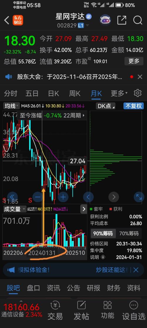 $星网宇达(SZ002829)$最近走势是强于大盘的,周五的上影线只说明前期潜伏的人出逃,也可能是(看月线)去年1月套住的人解套出来了。 从走势看,这位置折腾就为突破月线大箱体做准备 下周有一个放量上下折腾的过程。