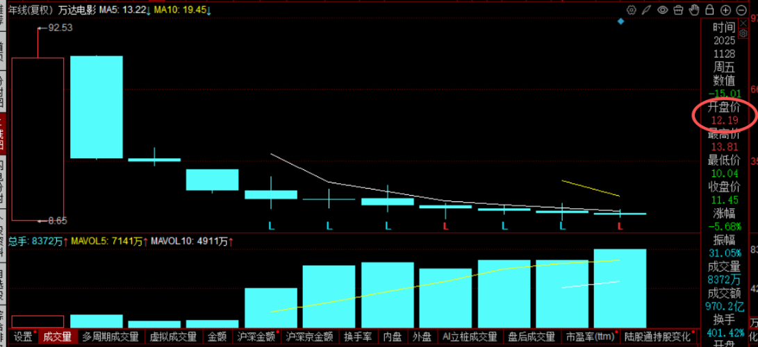 万达电影,12月需要涨过12.19,年线才能避免10连阴 $万达电影(SZ002739)$