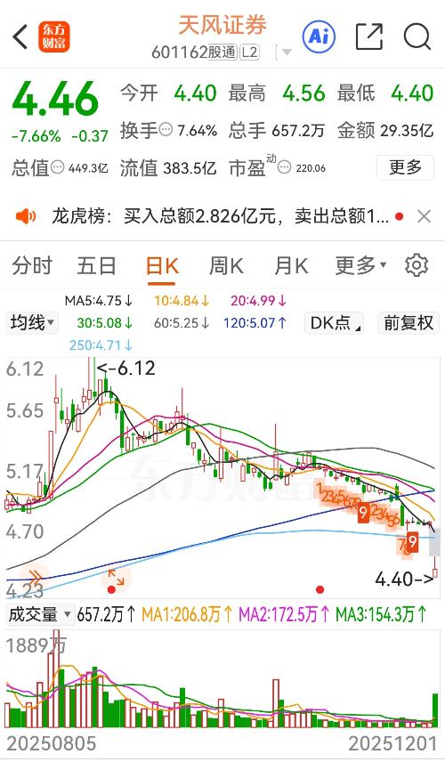 天风证券前股东问题,现在依然强势追责,说明了目前A股的体制日趋完善,事后亦会追责而且可能是终身追责,失联了跑路了出国了都要追回来接受法律的审判,这对于A股那些心存侥幸的违法行为是一记警钟。 技术面天风证券量价背离拉升出现了回调,周线看天风证券的黄金分割线3.68元是强支撑线,3.68元之下的性价比非常高。底部连线明显被破位击杀。 利空消息面下天风证券股东情绪冰点,好消息是利空消息没有跌停!保持观望...