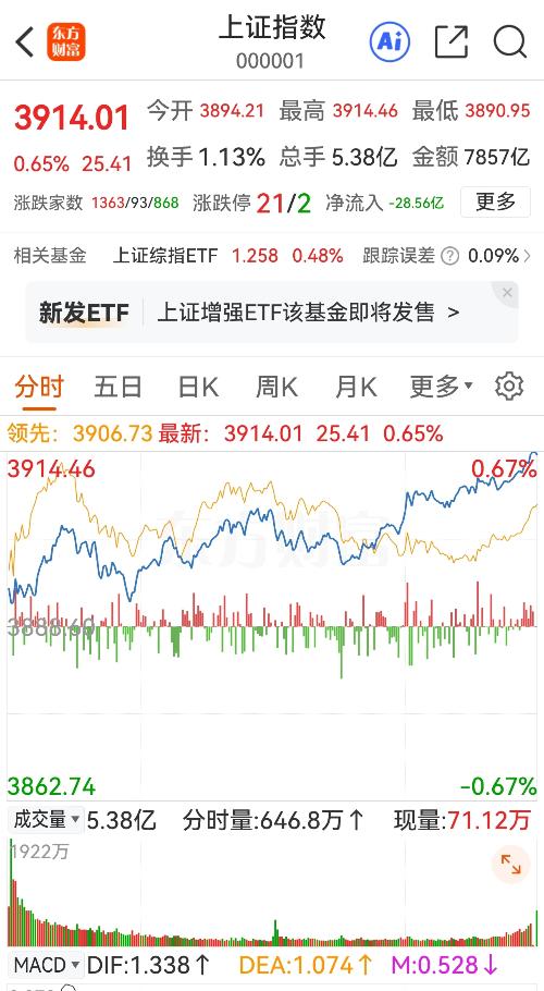 大家来了,先帮着点个赞留个言转发一下吧,谢谢啦。 今日浮盈三万六,春节前不会新进资金,包括今年前些时候转出去的一百万。我认为春节前很难站上四千点,大家拭目以待。 一、沪指再上3900,个股步伐却蹒跚 今天市场走得挺热闹,沪指又一次站上了3900点,深成指和创业板也涨了一个多点。盘面上差不多3400只股票在涨,成交量比昨天多了不少,接近1.9万亿。看起来红红火火,但不知道大家注意到没有,下午那股冲劲...