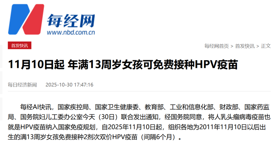 政策落地:七部委联合发文,开启免费接种新时代 2025年10月30日,国家疾控局等七部委联合宣布,经国务院同意将HPV疫苗正式纳入国家免疫规划。自2025年11月10日起,2011年11月10日后出生的满13周岁女孩可免费接种2剂次双价HPV疫苗(间隔6个月)。这一覆盖全国的普惠政策,不仅标志着中国宫颈癌防控进入“国家兜底”新阶段,更给万泰生物(603392.SH)、智飞生物(300122.SZ)...