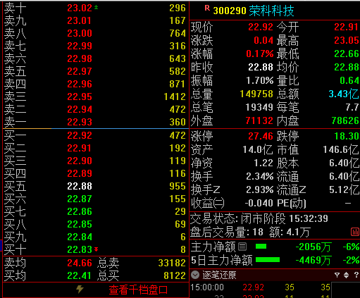 10619- 根据本帖内容,回溯高管减持,第一天减持55000股,价格27.33,估测分三笔,分别是13:59:03一笔300卖单,14:08:43一笔150卖单,14:08:44一笔100卖单。第二天减持6000股,成交价28.39,估测分两笔,分别是11:17:16一笔挂20卖单,11:17:17一笔挂35卖单。第三天减持2000股,估测是13:34:27一笔20卖单。该高管减持三笔,减持总均价与减持第一天价格高度重合,27.33对应174.9亿市值。该高管对荣科业绩门儿清,而且是在公积金弥补亏损后减持,如三季报业绩暴雷,就有内幕交易之嫌疑,只有三季报不差才能合理解释因个人资金需求导致的减持。