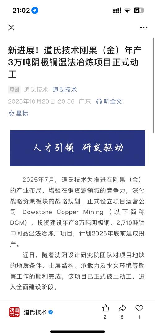 新进展!道氏技术刚果(金)年产3万吨阴极铜湿法冶炼项目正式动工 届时,道氏技术阴极铜总年产能将提升至10-10.5万吨,钴中间品总年产能将达到5,700吨。 满产后估计在营收300亿。进利润6个亿左右。这样看,大盘如果不跌,现在可以买了