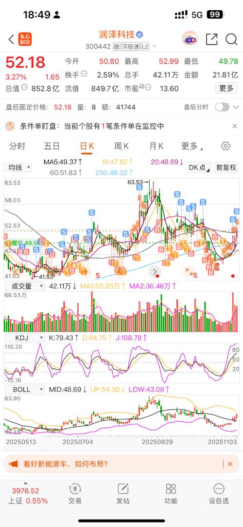 $润泽科技(SZ300442)$润泽是我持股以来从未亏损过的票(还有一只是“伯特利”),我从不盲目看多看跌,这波从低位横盘起来靠的是三季报业绩,修复估值走势不错,但股价已经在日线级别超买区间运行4日回调迫在眉睫,今日早盘又突破60日线阻力走出近期高点,量能却是萎缩的,这种背离也是调整的预兆,为防止坐过山车我已经减仓2/3,等回踩5日线再加仓,润泽后续依旧看多,上60应该为期不远