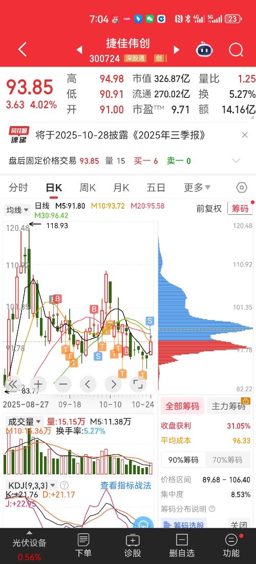 $捷佳伟创(SZ300724)$我半年报预喜涨停板买的半仓,一直到118见顶后108卖的,后来又操作几次,有赚有亏,成本早到60以下。持有,怕球