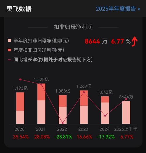 $奥飞数据(SZ300738)$ 奥飞数据业绩暴增:机构预测2025年净利润将创历史新高,股价上涨空间有多大? 数据中心机柜数量半年激增14000个,EBITDA同比增长超50%,奥飞数据正以迅猛势头拥抱AI算力浪潮。 奥飞数据发布的2025年半年度报告展现出强劲增长势头。2025年上半年,公司实现营业收入11.48亿元,同比增长8.20%;归母净利润0.88亿元,同比增长16.09%。 更引人注...