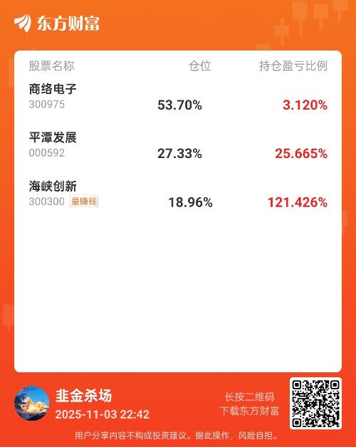 $平潭发展(SZ000592)$$海峡创新(SZ300300)$$商络电子(SZ300975)$我跟平潭杠上了,全仓平潭票,为什么选择平潭,因为统一,平潭有可能会是下一个深圳。 三只票,发展在平潭有地,海峡是平潭国资,商洛投资平潭本土芯片半导体。仓位分配,发展妖股,拿不到筹码,海峡涨高了,最先做的就是海峡,最近刚做商洛,商洛还没被挖掘出来。