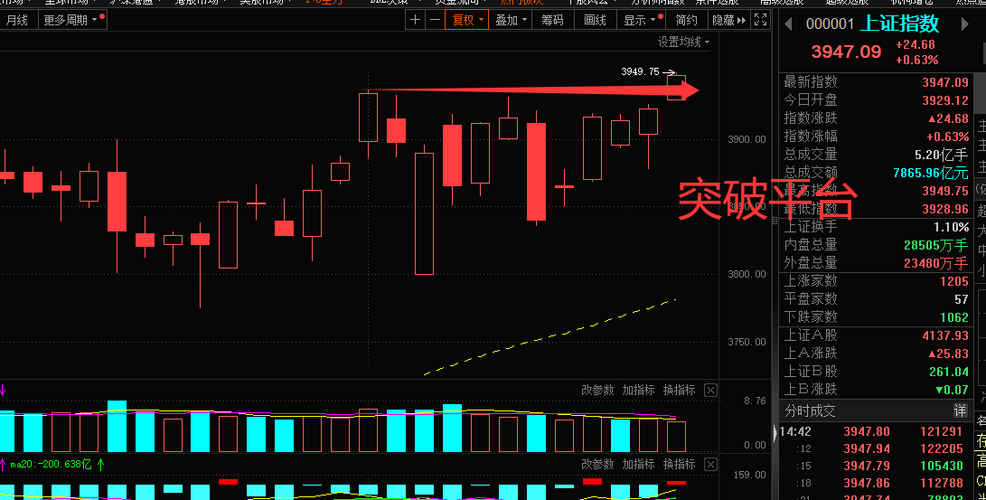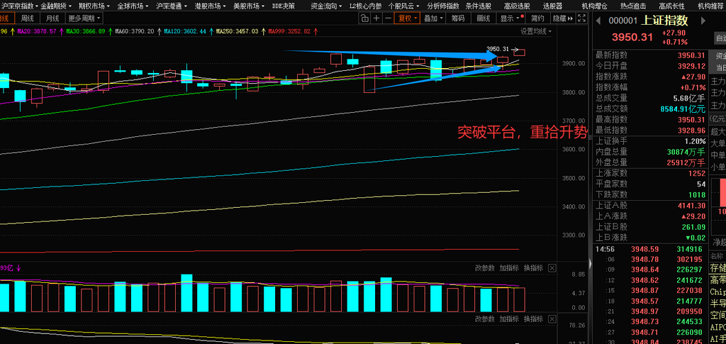 整体回顾 今天A股算是走出了强者姿态,沪指直接冲破压力位,收盘站稳3950点,创下近十年新高,三大指数全线飘红,其中科创50最亮眼,涨幅超4.6%,创业板指也一度涨过3.5%,妥妥的科技股主导行情,资金面更是给足了支撑,全天成交量逼近2万亿,比昨天明显放量,能看出场外增量资金确实在进场,不过也别被指数的热闹骗了,实际上涨跌个股几乎各占一半,还是指数好看,操作难搞的老情况,短线股很多都在跌,小市值的...