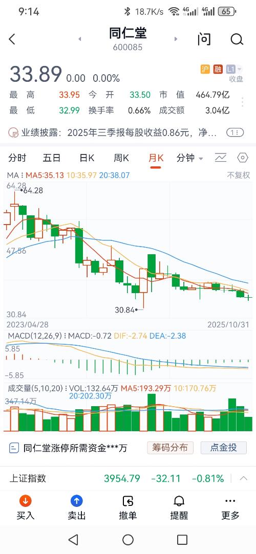 $同仁堂(SH600085)$去年9月30日42左右进了4千5同仁堂,今年9月二十多号34块96卖掉,持股一年亏了3万多,同仁堂的药,根本没有卖出品牌优势可惜了,利润是不是被管理层体外循环走了,不得而知。现在新的管理层要起来,恐怕还需二到三年。