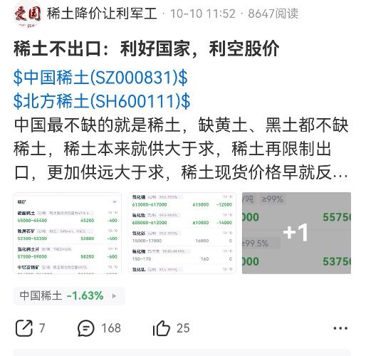 $中国稀土(SZ000831)$ $北方稀土(SH600111)$ 如果中国稀土可以放开军用重稀土的出口,中国稀土的股价将以一字连板的方式涨到100元以上 都知道我是做空的,为什么我要说能涨到100元以上? 因为绝对不可能 周末消息:老美求我们谈判,想要我们放开军用重稀土出口 如果我们同意放开,那老美会不计代价购买一切能买到的稀土。老美大量囤货,那么中国稀土的销量就来了,也可以按国际稀土价格高价卖...
