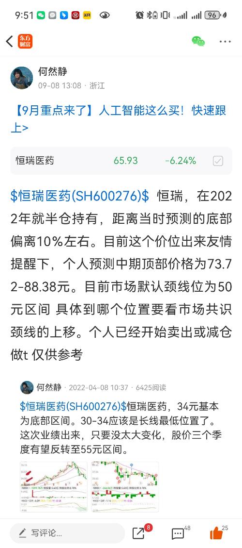$恒瑞医药(SH600276)$9.8号已经发帖提醒,73.72元卖出的筹码今天可以择机买回来!如果拿长线,这十个点基本就是白送的。恒瑞中期趋势还是在50-88元区间震荡,不会大幅回落,也不会暴涨,否则怎么回购?