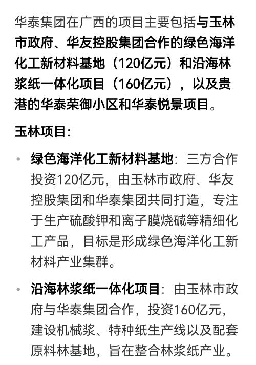 $华泰股份(SH600308)$ 广西华泰林浆纸一体化项目 项目名称:广西华泰林浆纸一体化项目 首发日期:2025年10月24日 地区:广西 行业/项目类型:轻纺食品/造纸印刷包装/造纸 项目业主:广西华泰生物基新材料有限公司 投资总额:1307723万元 当前进展:项目备案 建设地点:广西壮族自治区玉林市龙潭产业园区 建设内容 占地1853亩,项目分两期建设:一期规划建设40万吨莱赛尔天然纤维素...