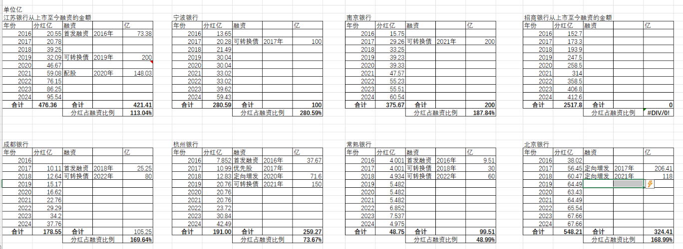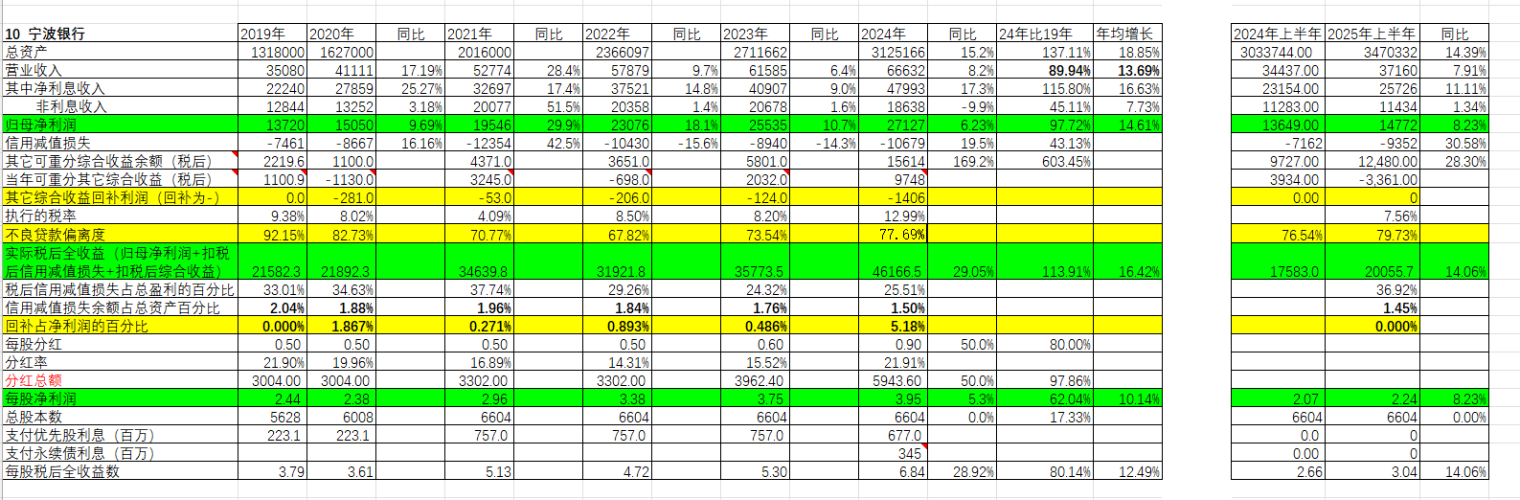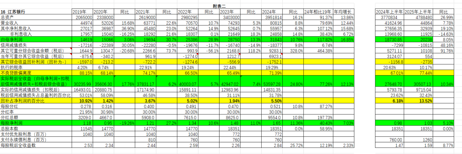 我们来看一下江苏银行,从2019年至2024年江苏银行总归母税后净利润增长了117.82%,在2020年前已上市的36家银行股里增长排名第三(前二名分别是杭州银行和成都银行)。每股税后净利润增长了40.43%,在2020年前已上市的36家银行股里增长排名第十二。同样我们用“全收益”数据来看,江苏银行5年的总“全收益”增长为77.26%,依然是处于2020年前已上市的36家银行股里增长排名第三,而每...