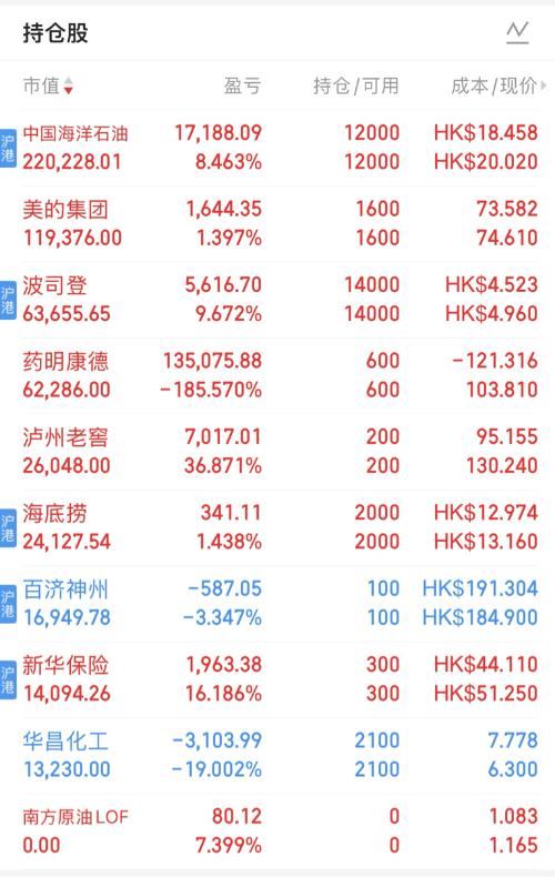$中国海油(SH600938)$ 本周小幅调仓。 以20.06港元小幅卖出海油H1000股(18.79港元买入),现持1.2万股,成本价由于做T获利、股息入账(7000股,0.5256港元/股)降至18.458港元,仓位39.1%,继续大幅领跑其他持仓; 以12.92~13.18港元做T海底捞1000股,成本降约0.1港元至12.974港元,仓位4.3%; 以6.29元买入华昌600股,略升仓位至...
