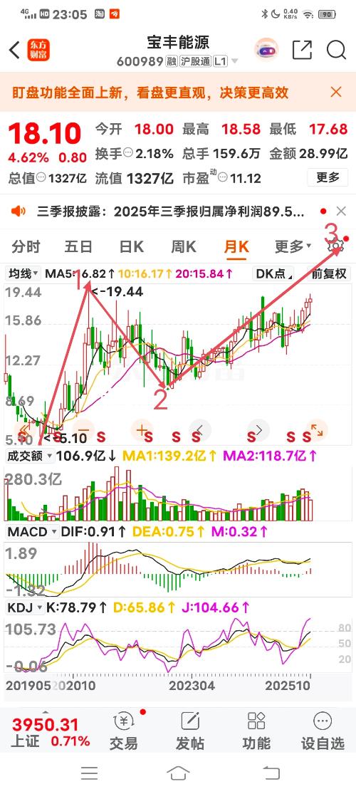 $宝丰能源(SH600989)$一、公司基本面 公司属于化工原料板块,具有跨境电商、碳中和、煤化工、煤炭等概念,主营业务:煤制烯烃。三季报增97.27%,市盈率11.1倍,基本面良好。 二、走势浪型分析(前复权图形观察) 2020.02.04股价从历史低点5.27元开始向上运行1浪上升,2021.02.18见高点19.61元,涨幅272%,随后运行2浪下跌,2022.11.01见低点10.14元,...