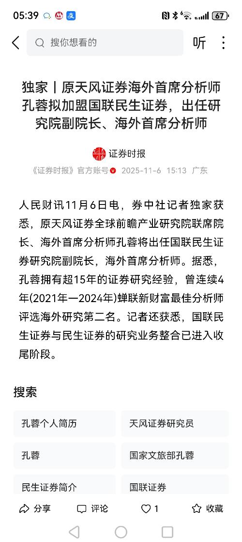 $天风证券(SH601162)$两个倒数的券商,国联和天风,员工还互相跳槽!券中社记者独家获悉,原天风证券全球前瞻产业研究院联席院长、海外首席分析师孔蓉将出任国联民生证券研究院副院长,海外首席分析师。